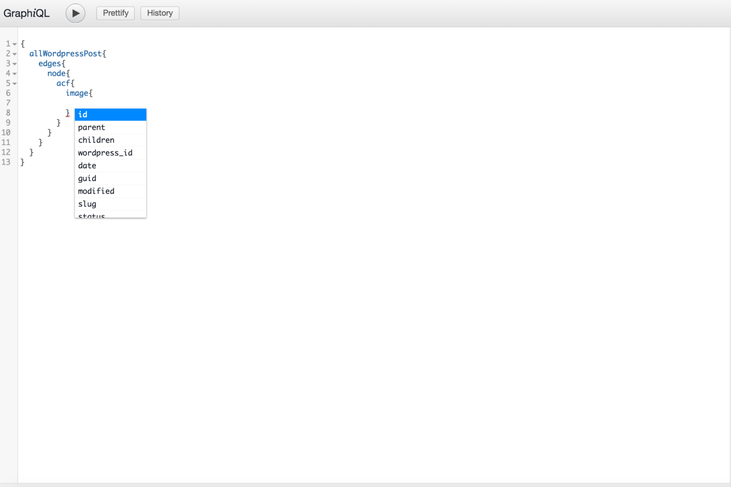 Once this plugin was activated, I used a GraphQL query in gatsby-node.js to request the additional ACF fields in the data response.