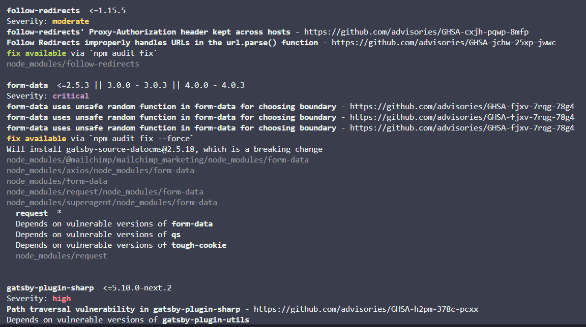 Well, we can see that the NPM audit also suggests updating the package to versions where fixes for the vulnerabilities have been patched.