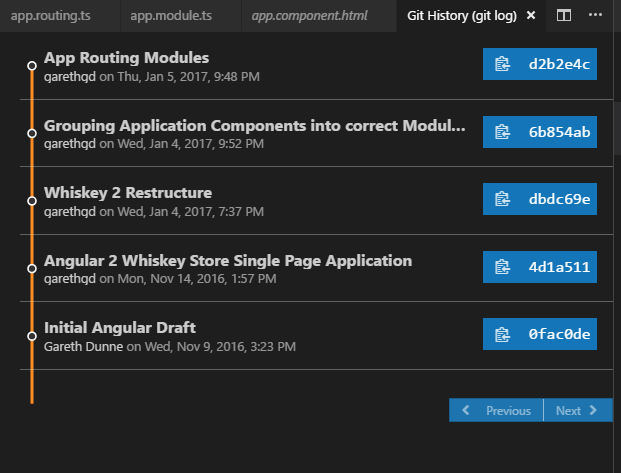 Another useful extension to install after you’ve initialized your git repository. You can view all your previous commits in a detailed window. In VSC press F1 followed by the command