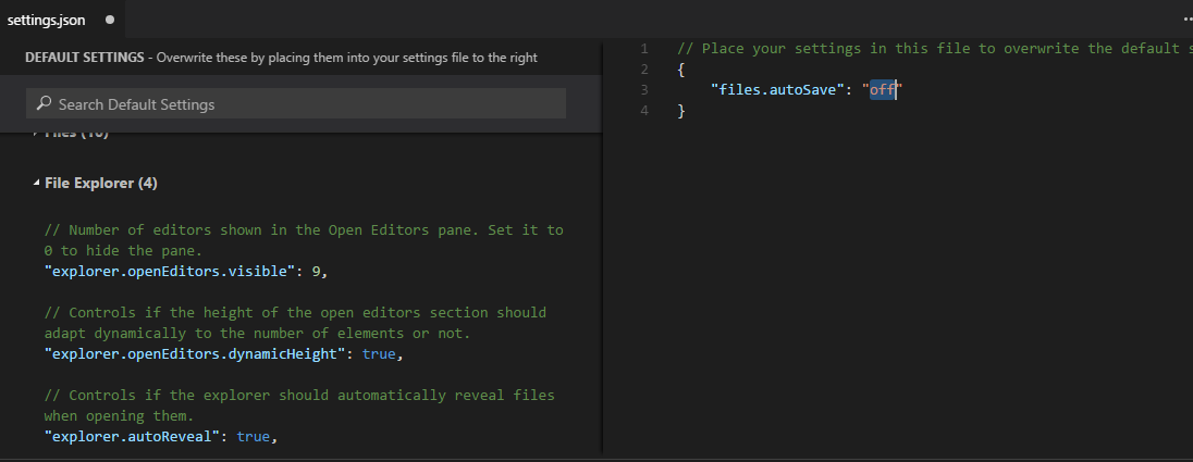 For example a useful change would be to change the property files.autoSave to “on” so that all our files are saved automatically. Simply apply this in the right window in the split editor and your files will no longer have to be manually saved.