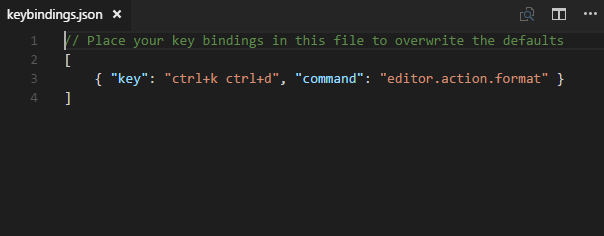 However, if you have previous experience working in the Visual Studio IDE you may wish to change this to Ctrl + K + D . In order to do this, we can navigate to File – > Preferences -> Keyboard Shortcuts from here we can create a custom keybinding to override the default settings.